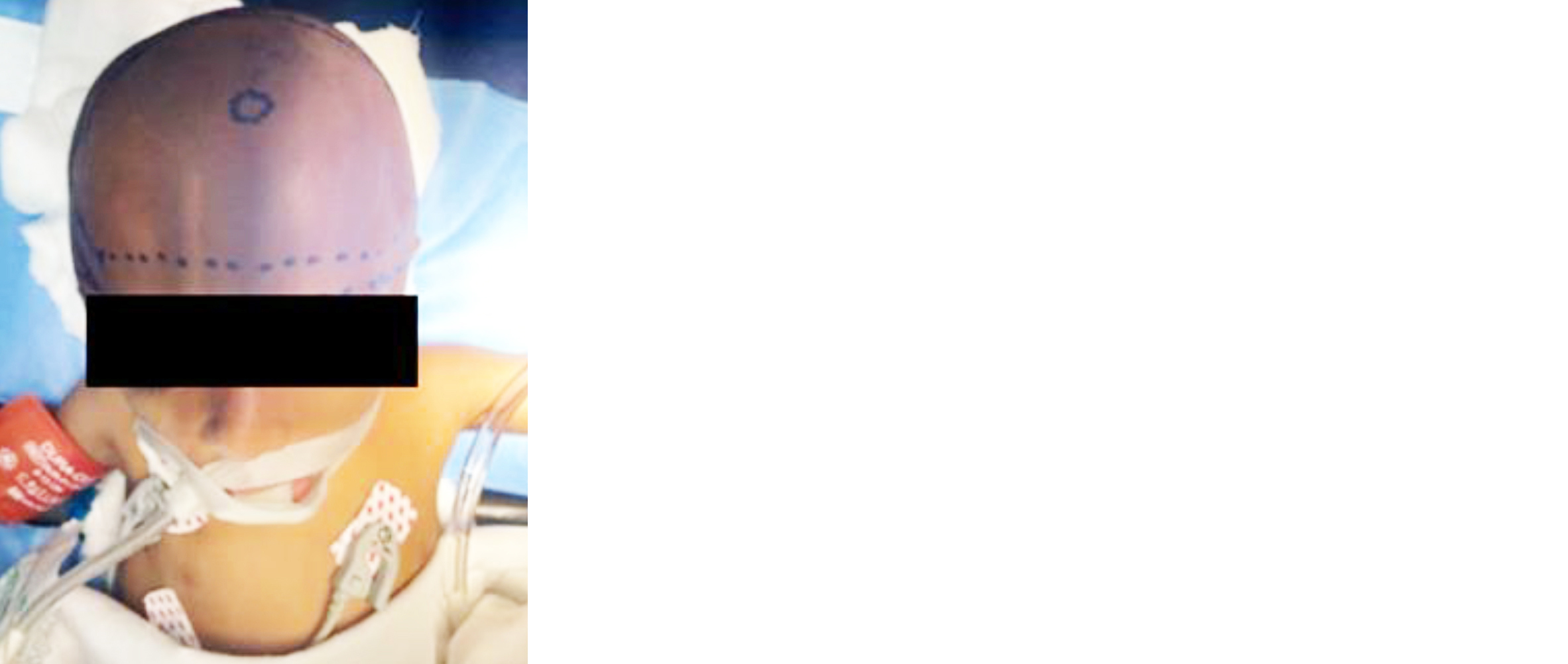 Figure 1: Pre-operative image of a 17-month-old baby with right coronal craniosynostosis. Planned surgical markings for fronto-orbital advancement are visible. The child is placed in the supine position under general anaesthesia, awaiting the cranial remodelling surgery.