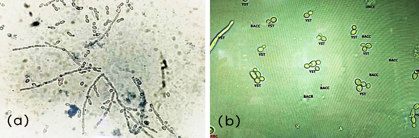 Figure 2: (a) Manual microscopy showing Candida at 400× magnification; (b) Erba Mannheim Laura XL image demonstrating Candida.