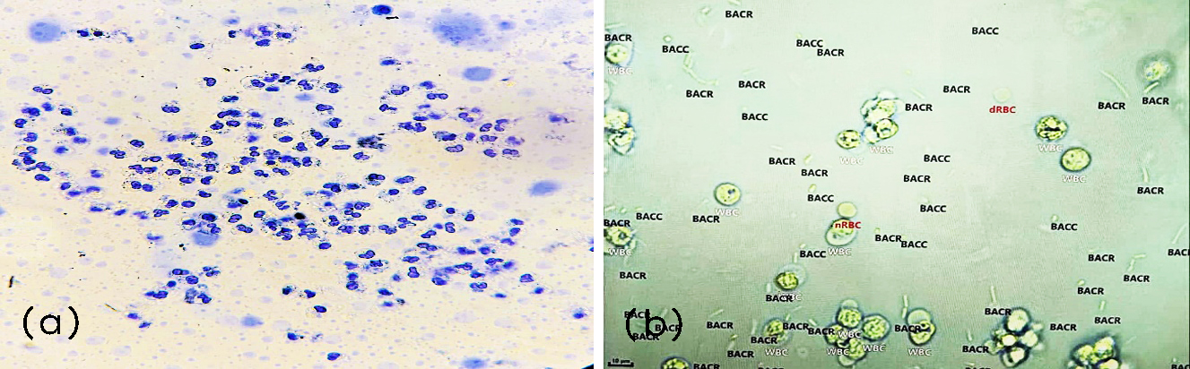 Figure 3: (a) Manual microscopy of Pus cells, under 400X, (b) Erba Mannheim Laura XL - pus cells.