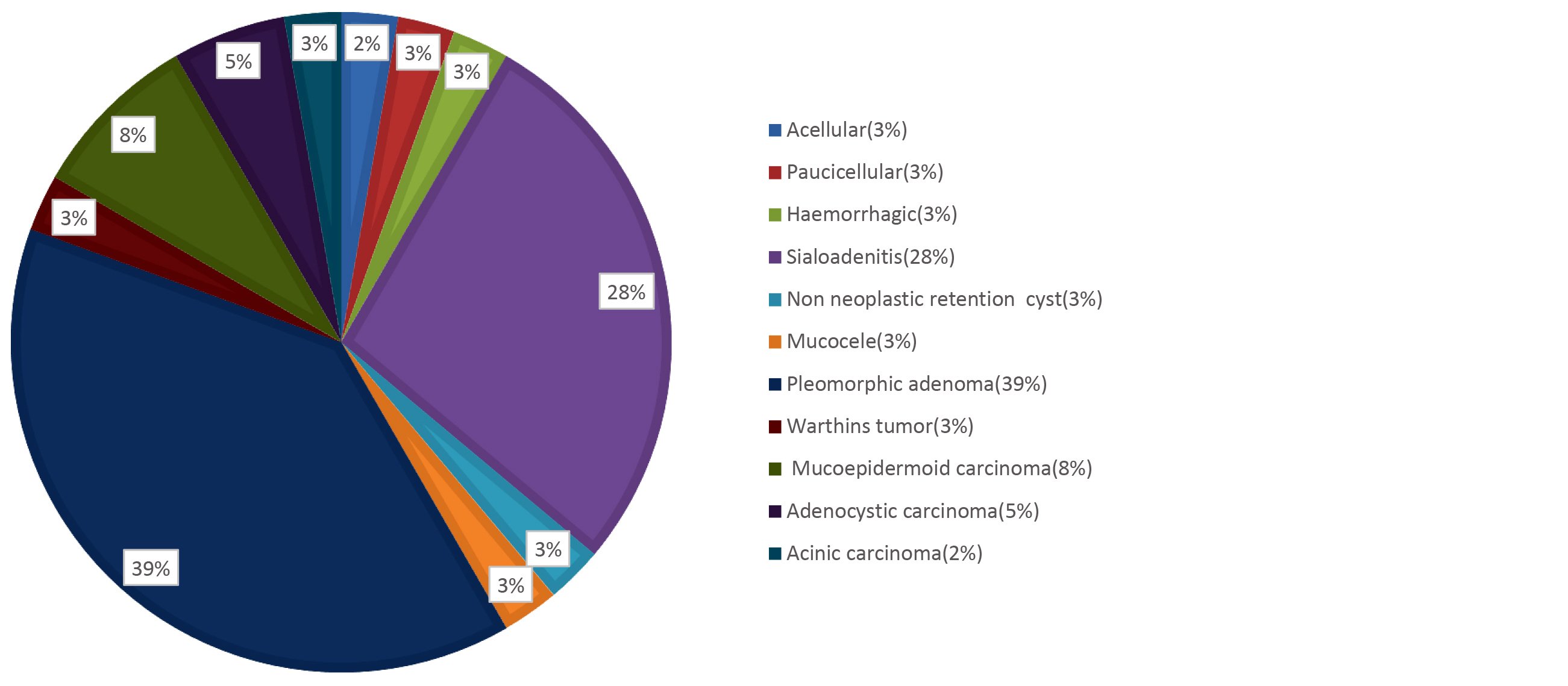 In terms of cytological diagnosis, pleomorphic adenoma was the most commonly reported lesion, accounting for 14 cases, followed by sialadenitis in 10 cases. Mucoepidermoid carcinoma was diagnosed in 3 cases, while adenoid cystic carcinoma was seen in 2 cases. One case each of acinic cell carcinoma and mucocele was also identified.