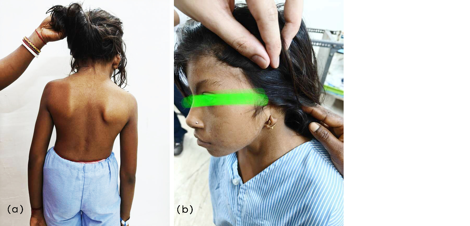 Figure 2: (a) Skeletal deformities showing scoliosis, short neck, abnormal shoulder and scapular orientation, and low hairline, (b) Deformed ear.