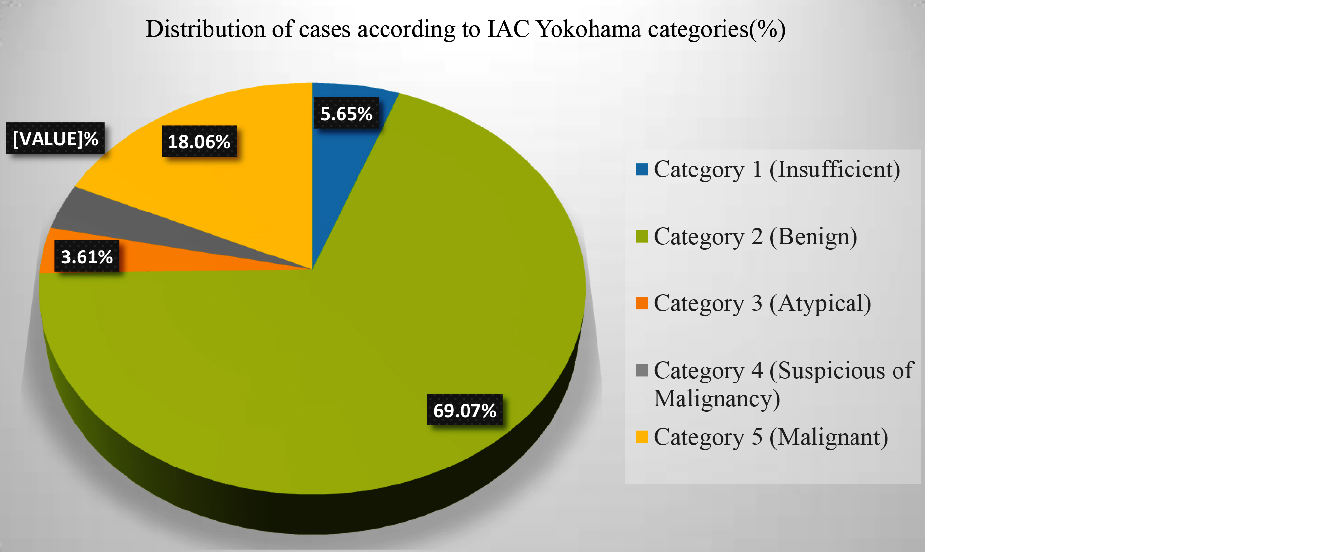 The five categories of the IAC Yokohama System for Reporting Breast Cytopathology [4] include: Category 1: Insufficient; Category 2: Benign; Category 3: Atypical; Category 4: Suspicious for malignancy; Category 5: Malignant.